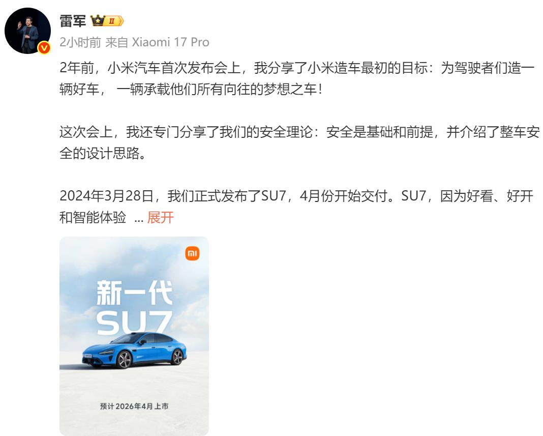 据介绍,在用户反馈的推动下,小米即将推出SU7的首次改款车型——新一代SU7。新车将于2026年4月正式上市,并于今日上午10点开启小订。