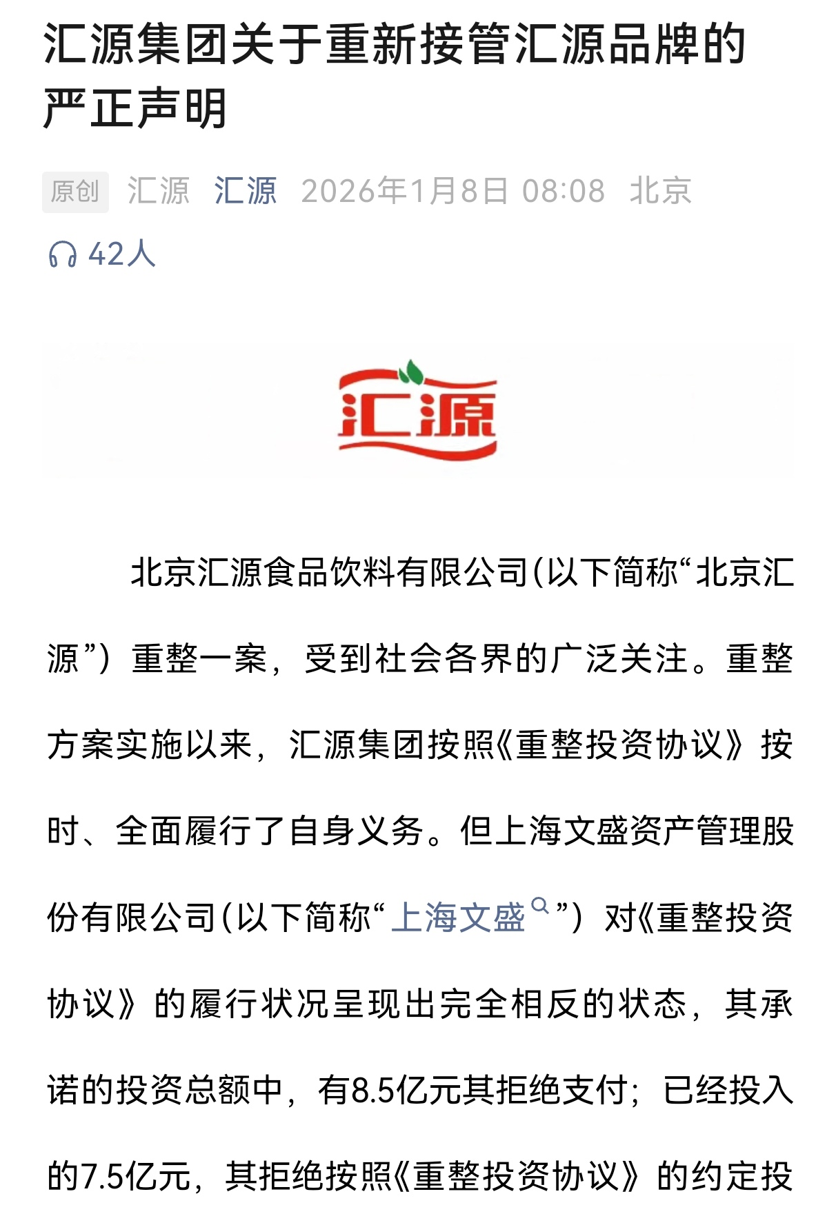 双方矛盾的根源在于资金缺口。根据2022年北京汇源的重整计划及重整投资协议约定,文盛资产应通过诸暨文盛汇和天津文盛汇向北京汇源出资16亿元,对应取得北京汇源70%股权。然而截至目前,北京汇源仅收到诸暨文盛汇7.5亿出资款,剩余8.5亿出资款仍未到账,且已逾期一年。北京汇源方面此前公开表示,实际到位的6.47亿元虽存入汇账户但由诸暨文盛汇直接管控,并未投入北京汇源的生产经营活动。