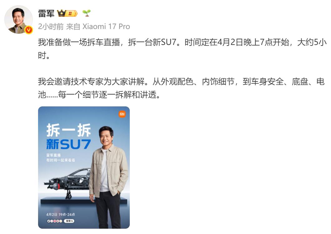 【环球网科技综合报道】4月1日消息,小米集团创办人、董事长兼CEO雷军通过社交媒体公布,其将于4月2日19:00至24:00开启一场长达5小时的“拆车直播”。