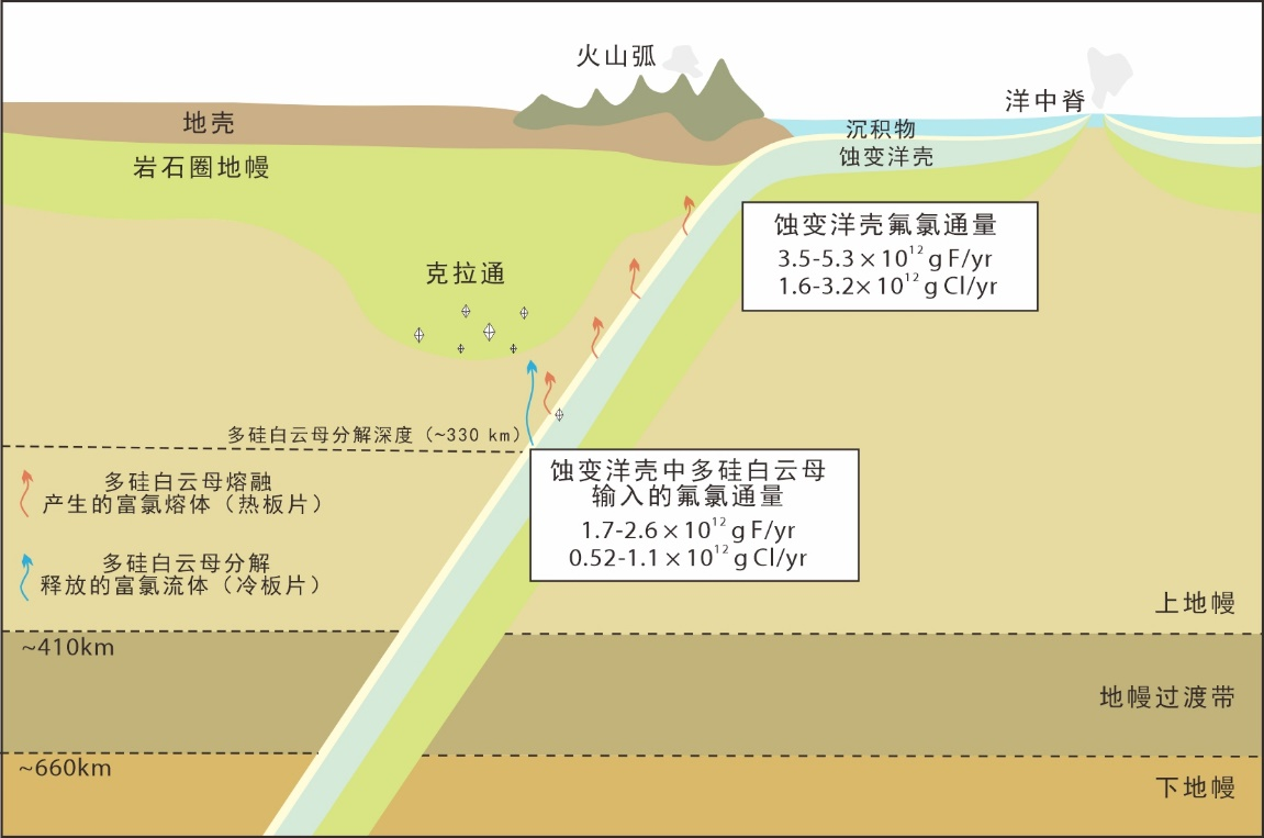 更出人意料的是,多硅白云母并非简单地将两种元素“一路带到底”。当它在更深处失稳分解或发生熔融时,氯更容易随深部流体迁移,而氟则会被新的矿物相“接力”带往更深处。
