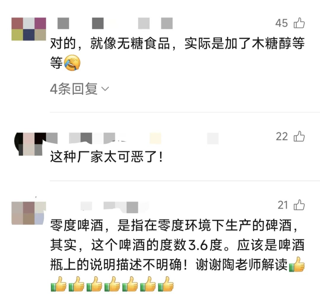 陶淳提醒大家:以后再喝“零度”或“无醇”啤酒时,千万别被误导!一定要仔细甄别配料表的内容,同时也呼吁相关部门,对打擦边球的品牌予以重视并整改!应该在瓶身包装的显著位置标注醒目的“含酒精”字样。