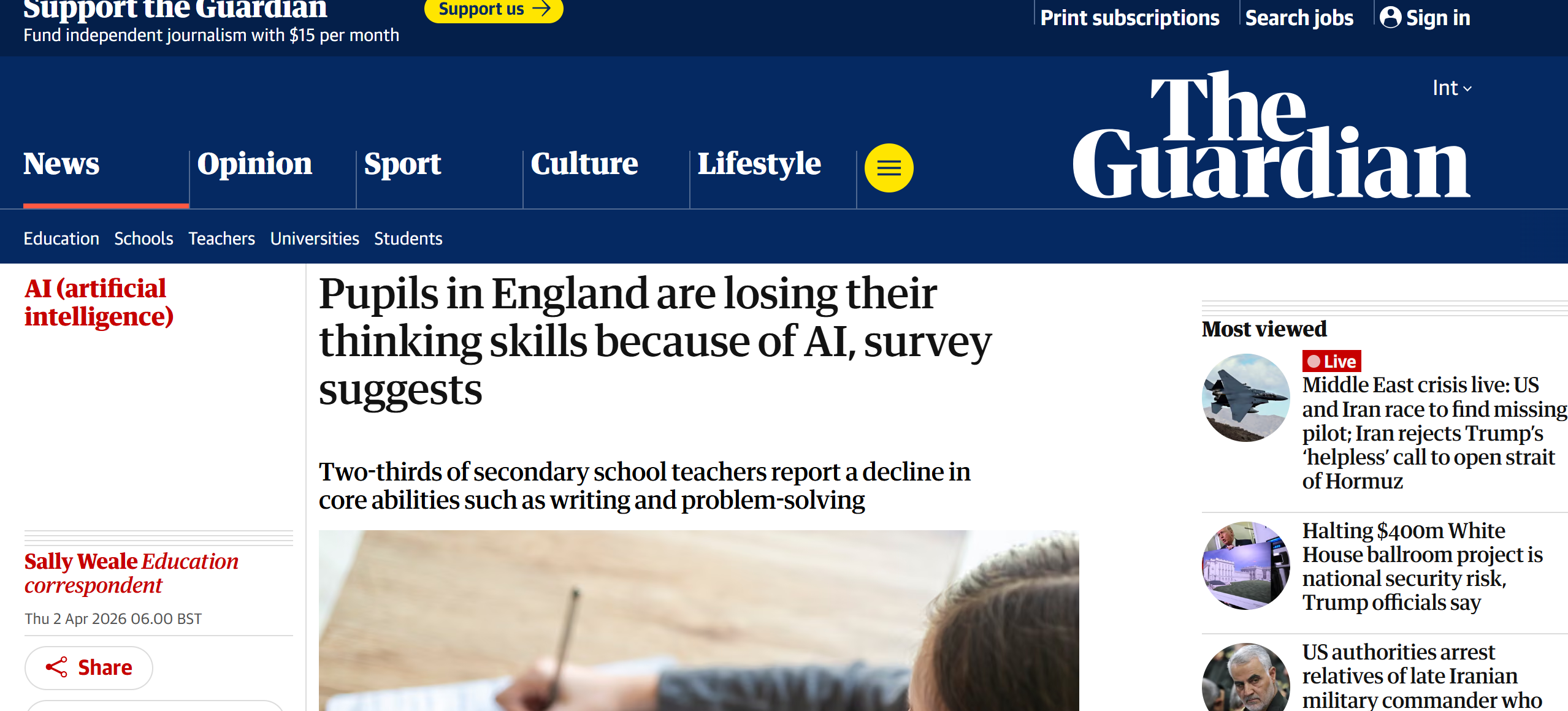 【环球网科技综合报道】4月5日消息,据英国《卫报》报道,人工智能技术在英国中小学教育场景快速普及,在带来教学便利的同时,也引发学生独立思考能力弱化、基础学习技能下滑等问题。英国全国教育联盟一项针对英格兰中学教师的调查显示,近 6000 名教师对此表达担忧,教育界呼吁建立健全监管体系,让技术赋能与教育本质协同发展。
