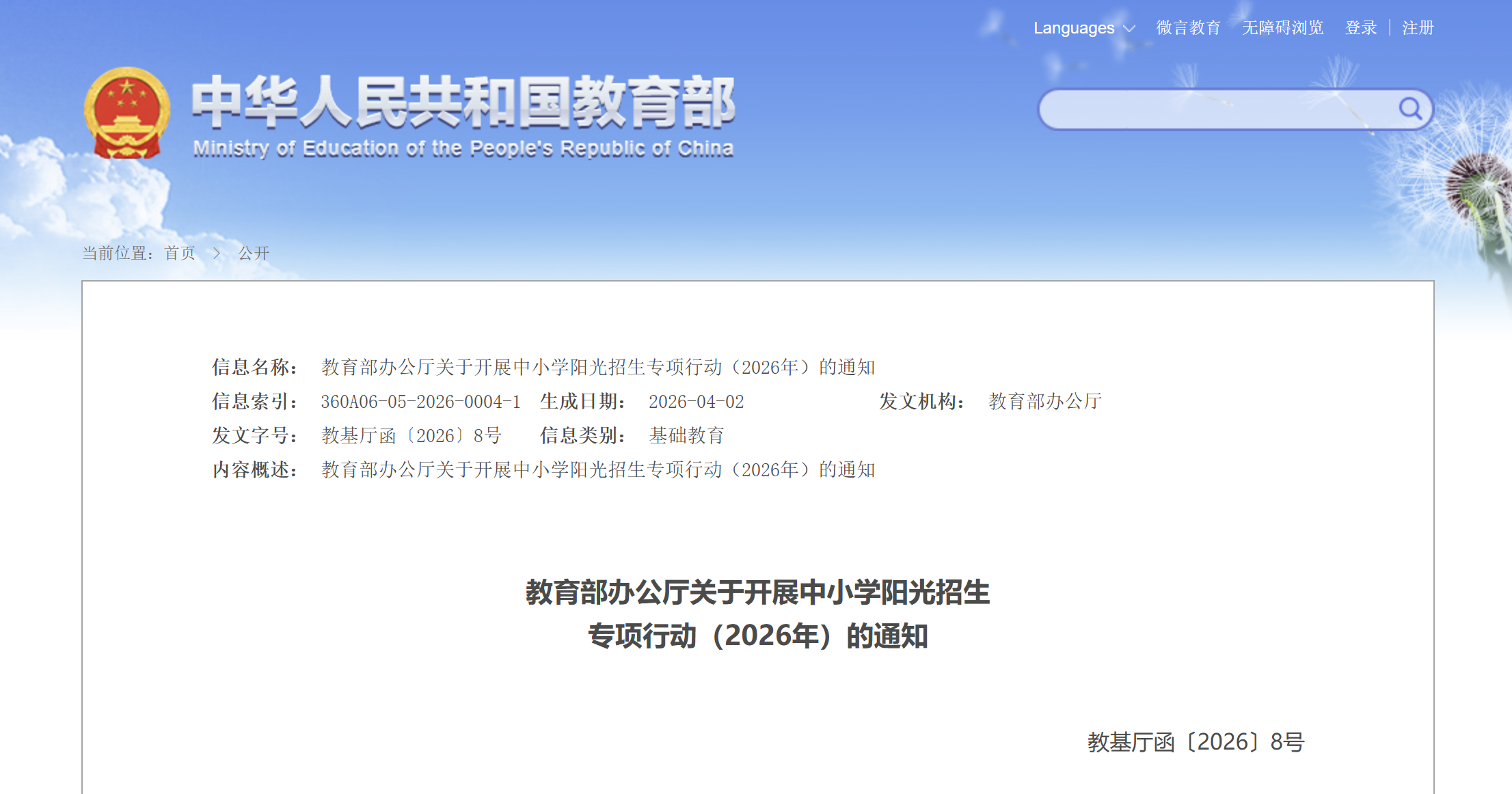 【环球网报道 记者 陈全】4月3日,记者从教育部获悉,为持续提升中小学招生入学工作的规范化与科学化水平,切实维护教育公平,保障适龄儿童少年平等受教育权利,在巩固义务教育阳光招生专项行动成果的基础上,教育部决定开展中小学阳光招生专项行动(2026年)(以下简称“专项行动”)。