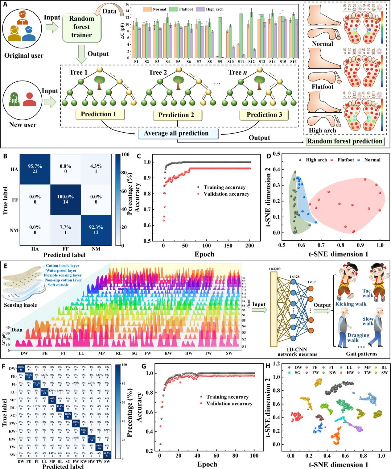 硬件采集的足底压力数据只是原始信息,真正的价值在于解读。鞋垫通过16通道无线模块实时传输数据,嵌入的人工智能算法则扮演了“解码者”的角色。经过训练,系统对足弓异常的识别准确率达96%,对12种病理步态的综合分类准确率达97.6%,涵盖帕金森病慌张步态、脑卒中偏瘫步态等。