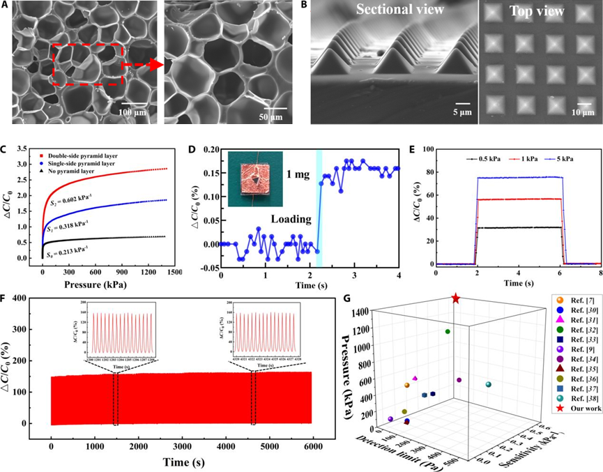 受此启发,团队设计出双微结构电容传感器,实现了高灵敏与宽量程的统一。其检测下限低至0.10帕斯卡——相当于羽毛轻触脚底的力度;最大量程高达1.4兆帕,足以承受剧烈运动时的瞬间强冲击。即便经过12000次循环加载测试,传感器性能依然稳定。
