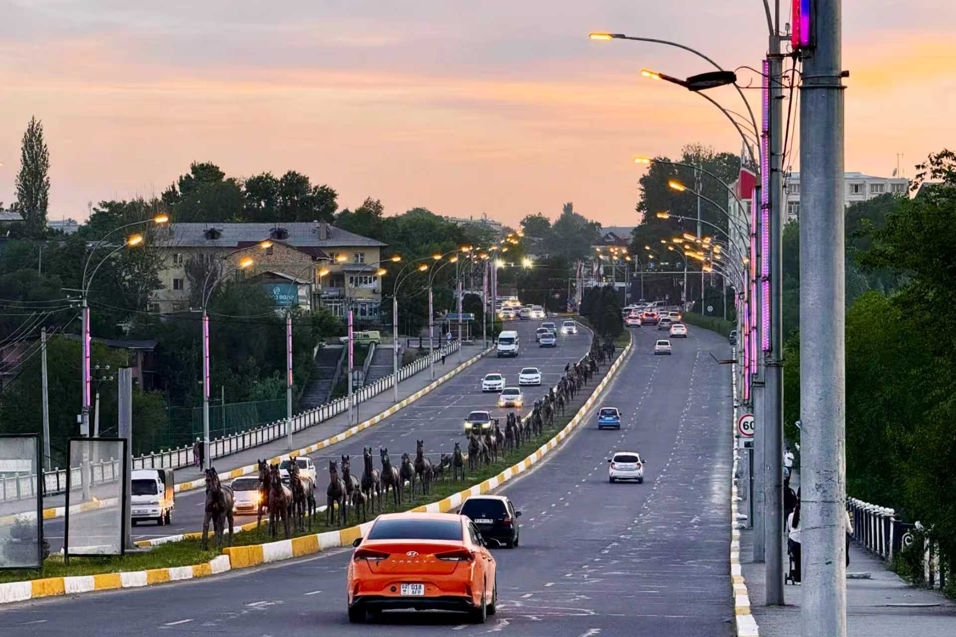 奥什的建城相传始自亚历山大。汉代古籍中称此地为“贰师”,与乌兹别克斯坦的浩罕、塔吉克斯坦的苦盏同属大宛。《史记·大宛列传》中记载,大宛“多善马,马汗血,其先天马子也”。今天的奥什街头,有汗血宝马与丝绸之路的雕像群,笔者乘车驶过时,耳边仿佛传来奔腾的马蹄声……