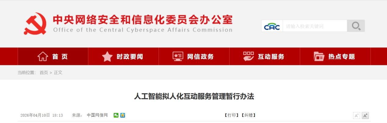 【环球网科技综合报道】4月11日消息,国家网信办、国家发展改革委、工业和信息化部等五部门10日联合公布《人工智能拟人化互动服务管理暂行办法》。办法提出,提供拟人化互动服务,不得向未成年人用户生成可能引发未成年人模仿不安全行为、产生极端情绪、诱导未成年人不良嗜好等可能影响未成年人身心健康的内容。