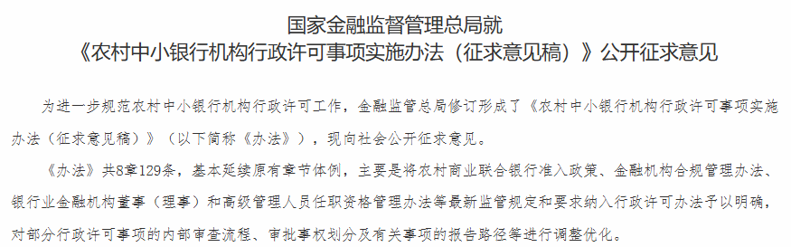 【环球网财经综合报道】国家金融监管总局就《农村中小银行机构行政许可事项实施办法(征求意见稿)》(下称《办法》)公开征求意见,意见征集将持续至2026年5月10日。此次修订不仅将农村商业联合银行准入、合规管理等最新监管要求纳入其中,更在发起人资质、注册资本、审批权限及高管管理等多个维度全面趋严,释放出强化农村金融风险防范的明确信号。