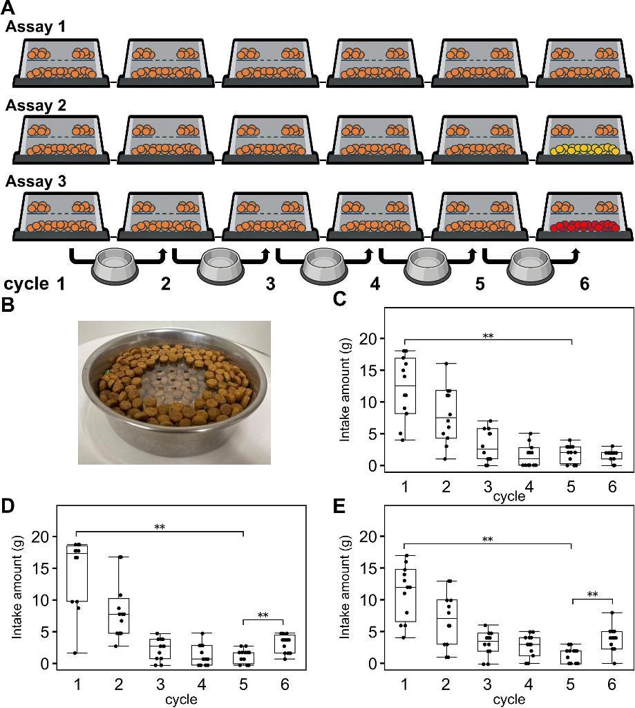 团队设计了一组精巧的对照实验:他们让猫咪经历6个“进食10分钟+休息10分钟”的循环,结果发现,如果每次端上同一种猫粮,猫咪的食量会逐轮递减;但若轮流更换口味,食量下滑的幅度便大幅缓解。