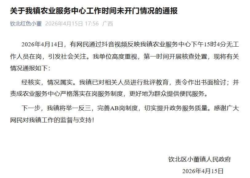 广西钦州市钦北区小董镇人民政府4月15日通报,4月14日,有网民通过抖音视频反映我镇农业服务中心下午15时4分无工作人员在岗,引发社会关注。我单位高度重视,第一时间开展核查处置,现将有关情况通报如下: