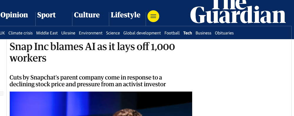 【环球网科技综合报道】4月16日消息,据The Guardian报道,社交媒体公司Snap发布内部备忘录,宣布启动一项重大战略裁员计划,涉及约1000名团队成员(占其全职员工总数的16%),同时关闭超过300个未填补的职位空缺。该公司明确表示,此次裁员与组织优化是“为应对人工智能技术快速发展带来的行业变革”。