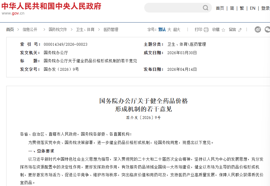 【环球网财经综合报道】4月15日,创新药板块大幅走高,Wind创新药指数上涨2.24%。此前一天,国务院办公厅印发《关于健全药品价格形成机制的若干意见》(简称《意见》)。这份从四大维度出台14条具体举措的重磅文件,明确释放出为高水平创新药留足价格空间的信号。