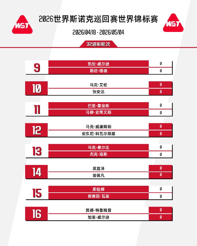 至此,加上直接入围正赛的丁俊晖、赵心童、吴宜泽、肖国栋、斯佳辉,中国军团共有11人将亮相正赛,刷新历届世锦赛中国选手参赛人数纪录。2026斯诺克世锦赛正赛签表↓↓↓