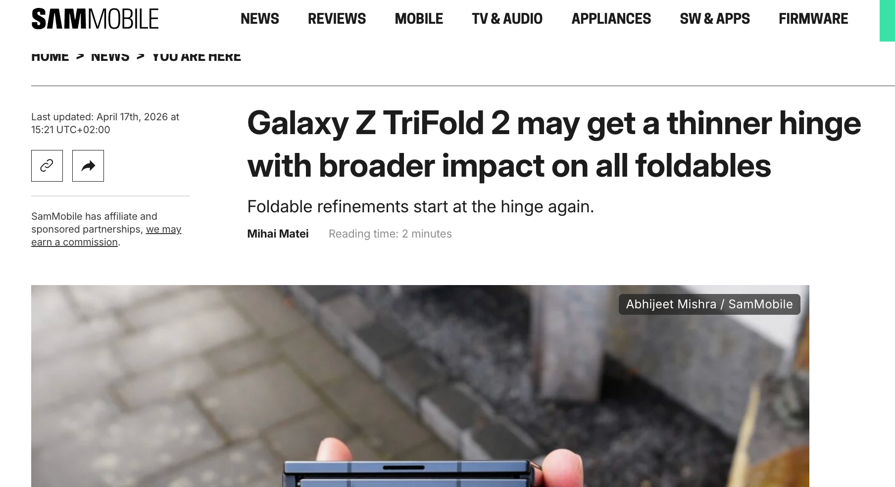 【环球网科技综合报道】4月18日消息,据Sammobile报道,三星供应链消息人士透露,三星电子正为第二代三折叠屏手机 Galaxy Z TriFold 2 开发全新铰链技术,旨在显著降低设备厚度并提升耐用性。该铰链方案或成为三星未来折叠屏产品的核心组件,覆盖多条产品线。
