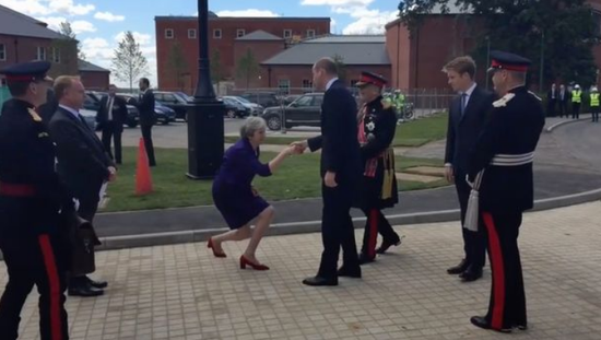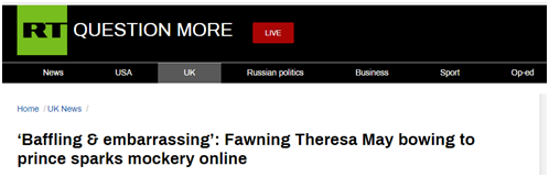 “被福布斯评为世界第八名最有权势的人,穿着高跟鞋向未来的君主行屈膝礼,就好像一个封建奴隶一样。”6月22日,今日俄罗斯在报道中这样描述梅姨,标题为:“‘令人困惑和尴尬’:特雷莎·梅对王子点头哈腰,引发网民嘲笑”。
