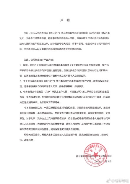 文中称:“李志老师文中多次提及毛不易,将该事宜与毛不易本人关联,且再次提及已经由责任方与其团队双方沟通解决的年初巡演之事。部分营销号夸大其词,将事件引导、包装称李志与毛不易的纠纷,给毛不易本人以及喜爱毛不易的朋友造成极大的困扰和伤害。”“希望大家更多的关注音乐人们原创作品,提高全民的版权意识,理智对待,诚挚感谢!”