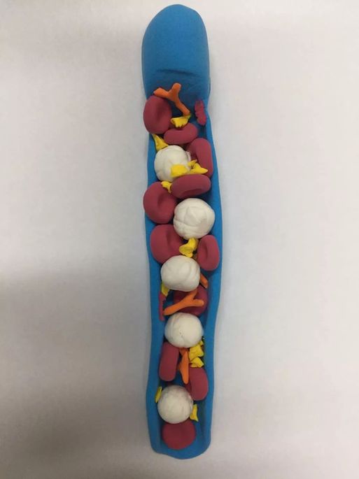 昆明市西山区春苑小学7岁李梦婷制作的静脉血管中的红细胞(双凹圆盘状)、白细胞(白色的细胞)、血小板(黄色)和血型抗体(橘色)