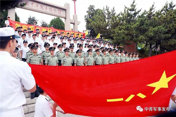在中国甲午战争博物馆前,来自3所高校的实习人员和舰艇官兵庄严宣誓:勿忘国耻,勤奋学习,振兴海军,扬我国威。宣誓的声音响彻云霄,表达的是当代青年铭记历史、勿忘国耻的沉痛心情,承载着他们立志报国、强军兴邦的责任感和使命感。