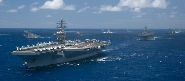 资料图片:2018环太军演舰艇编队,可见“卡尔·文森”号核动力航母。(图片来源于网络)