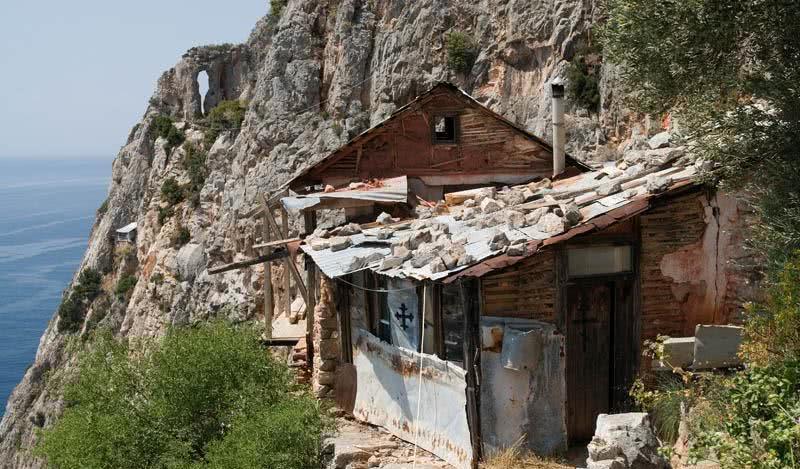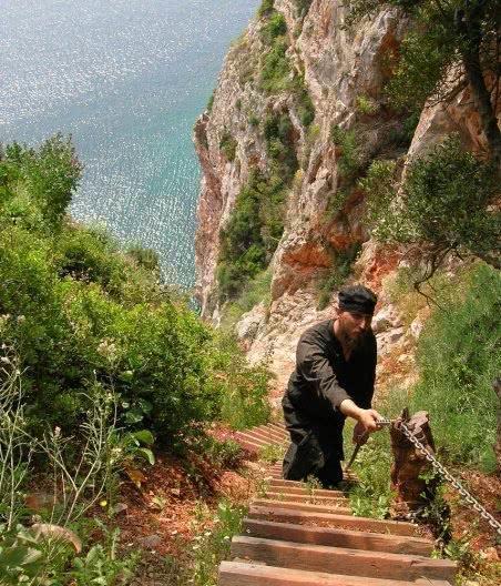 在希腊的阿克斯山,有上千名僧人生活在悬崖峭壁上,他们在悬崖上造起了一座一座的石屋,并且就生活在这里。