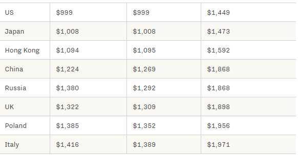 与去年相同的是,世界上其他地区的消费者,购买苹果最新款iPhone的价格要远远高于美国,例如在意大利,最低价型号的售价都高达1389美元,512GB版iPhone XS Max的售价更是高达1971美元,比美国高了足足522美元。