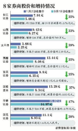在此之后的7月4日、7月9日、7月13日、7月24日、7月27日、9月12日,华泰证券、太平洋、国投资本、西部证券、东吴证券、国元证券分别发布了大股东增持计划的公告。据记者统计测算,如果上述所有公告内的增持计划全部完成,按照昨日收盘股价计算,预计总增持资金将近10亿元。很多公告也都提到,增持的原因是对公司未来发展有信心。