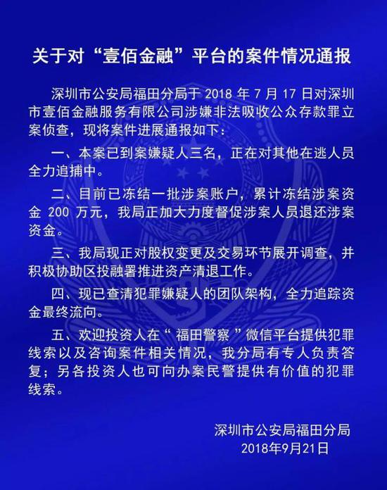 深圳市公安局福田分局于2018年7月17日对深圳市壹佰金融服务有限公司涉嫌非法吸收公众存款罪立案侦查,现将案件进展通报如下: