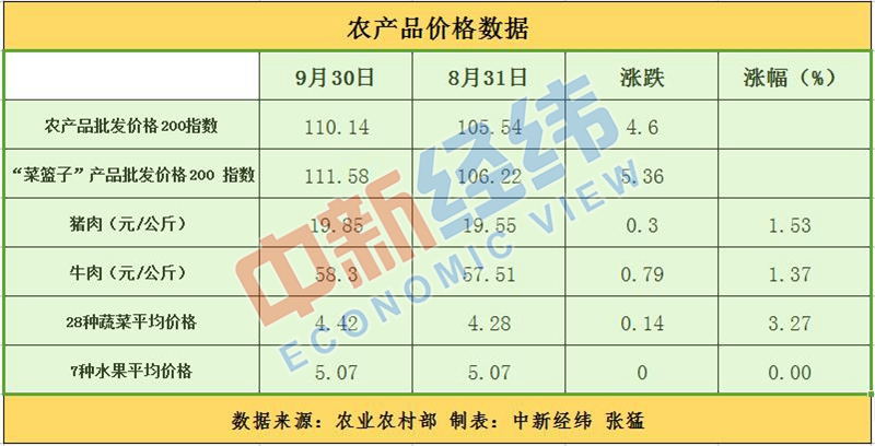 具体来看,9月30日,“农产品批发价格200指数”为110.14,较8月31日上涨4.6点;“菜篮子”产品批发价格200指数为111.58,较8月31日上涨5.36点。其中,全国农产品批发市场猪肉平均价格累计上涨0.3/公斤,涨幅1.37%;20种蔬菜平均价格累计上涨0.14元/公斤,涨幅达到3.27%。