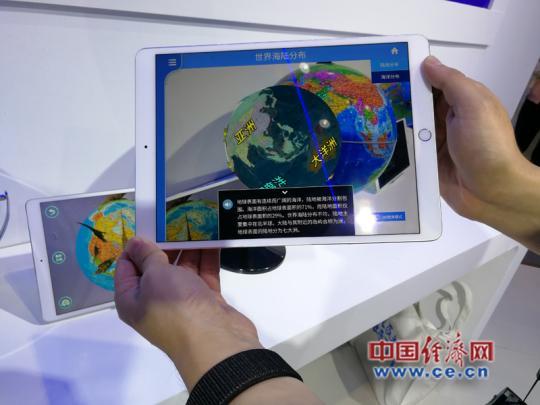 在线教育作业帮通过AR演示地理教学,气象现象、水文环境、宇宙行星等相关内容经现实增强后展现出来,极具趣味性和震撼力。杨秀峰/摄 |
