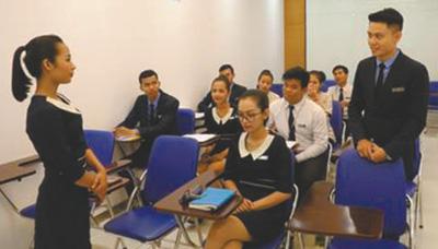 人事经理万利正给新入职的20多位柬埔寨员工培训中文。近年来,到柬埔寨旅游的中国游客越来越多,也给暹粒、西哈努克港、金边的免税店带来了商机。会中文成为在柬埔寨免税行业工作的必备技能。“每一名公司员工都要学习中文,这一关必须过。”万利说。中免会为每一批新入职员工开设为期两个月的中文培训班,有时也请当地孔子学院的老师来上课。