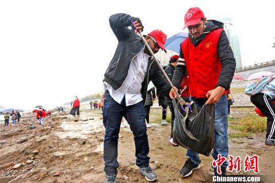"洋蚁工"在长江江滩边捡拾垃圾。 付蓓蓓 摄