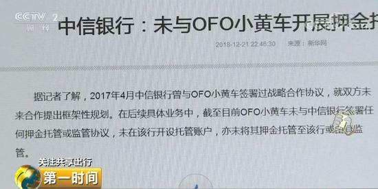 2018年12月21日,中信银行正式发表声明:2017年4月中信银行曾与ofo小黄车签署过战略合作协议,就双方未来合作提出了框架性规划。在后续具体业务中,截至目前,ofo小黄车未与中信银行签署任何押金托管或监管协议,未在该行开设托管账户,亦未将其押金托管至该行或由其监管。