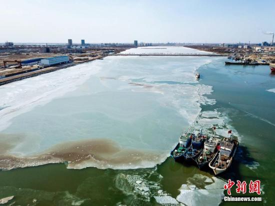资料图:山东省东营市当地的工程运输、海上油田巡线船只破冰通航,在海面留下明显航迹。文/梁犇 陈镜旭 高源 图/陈镜旭