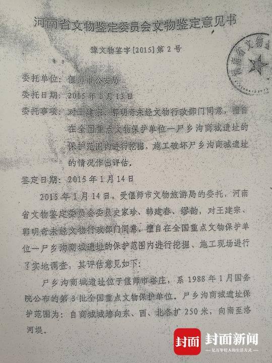 据此,“河南省文物鉴定委员会”于当天出具“豫文物鉴字[2015]第2号”鉴定意见书,称“南侧基坑已对尸乡沟商城遗址本体造成较严重的破坏”,其余两处基坑也对遗址造成安全隐患。鉴定人为史家珍、韩建春、缪韵,鉴定文书中,分别有三人签名,以及河南省文物鉴定委员会的公章。
