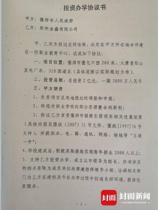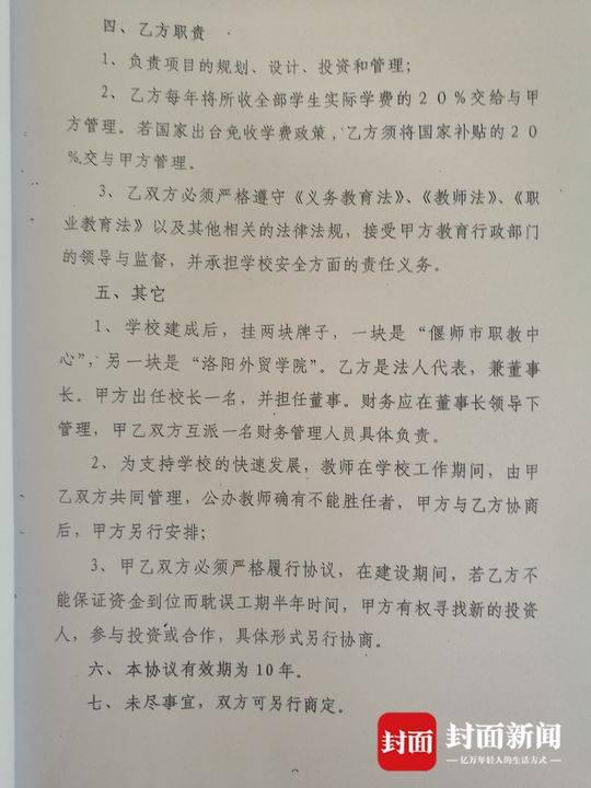 段继灵表示,政府承诺批给段继灵的土地有100余亩,他们要完成总投资2亿元的项目,首期投资是3000万元。偃师市人民政府负责用地规划的调整和申报。同时,依照协议,学校建成后,段继灵一方除挂偃师市职教中心牌子,还能挂牌洛阳外贸学院。后者系民办非学历教育培训机构。但因时局原因,这间学校变成了“小学+初中”形式的双语学校。
