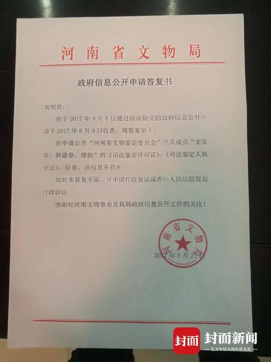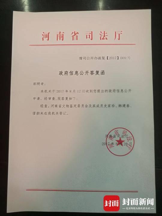 此外,在该案件中作出鉴定的鉴定人员史家珍、韩建春、缪韵三人,并不具备《司法鉴定许可证》以及《司法鉴定人执业证》,2017年8月21日,在河南省文物局发给郭明奇的《政府信息公开申请答复书》中,对该问题进行了证实。同时,2017年8月28日,河南省司法厅,同样回复郭明奇表示,“史家珍、韩建春、缪韵未在我机关登记”。