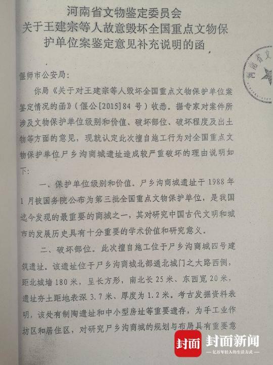 补充说明显示,此次擅自施工位于尸乡沟商城四号建筑遗址,“该遗址位于尸乡沟商城北部通北城门之大路西侧,距北城墙180米,呈长方形。南北长25米、东西宽20米,遗址夯土距地表深3.7米、厚度1.2米。”而此次并无鉴定人员签字。