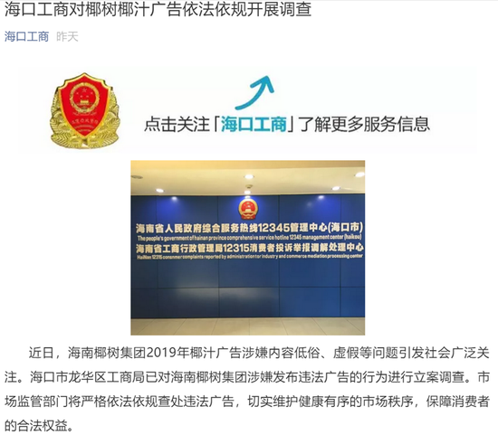 在媒体和网友排山倒海的质疑下,2月13日晚,海口市工商局官方微信号发布消息称,海口市龙华区工商局已对海南椰树集团涉嫌发布违法广告的行为进行立案调查,椰树也配合工作,撤换广告。