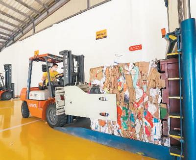 小黄狗公司分拣中心工作人员对废纸进行机械化压缩打包。