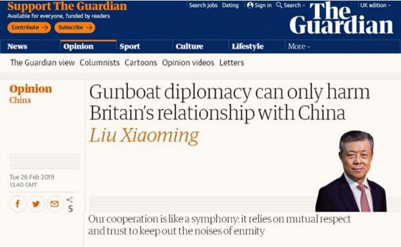 据中国驻英大使馆2月27日消息,英国主流大报《卫报》26日刊登刘晓明大使署名文章《“炮舰外交”只会损害中英关系》。