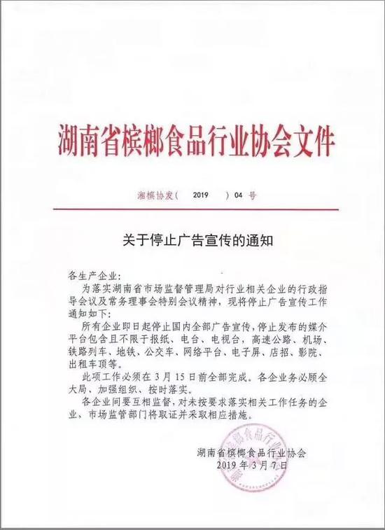 3月7日起,一份湖南省槟榔食品行业协会下发的《关于停止广告宣传的通知》(简称《通知》)在网上传播。该文件提到,湖南所有槟榔生产企业即日起停止国内全部广告宣传,且此项工作必须在3月15日前全部完成。有媒体已经从湖南省槟榔食品行业协会秘书长处证实,该通知系协会3月7日所发,“应湖南省市场监督管理局的要求。”