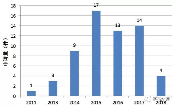 整体而言,国内企业的他达拉非专利布局起步相对较晚(图1),用“他达拉非”为检索词在知识产权局的专利检索及分析系统的主题词字段进行检索得出的国内企业申请的最早的专利是华海药业申请的制备方法专利(CN201110290260)。