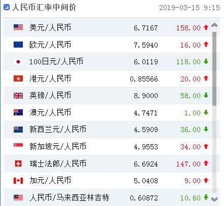 中国人民银行授权中国外汇交易中心公布,2019年3月15日银行间外汇市场人民币汇率中间价为:1美元对人民币6.7167元,1欧元对人民币7.5940元,100日元对人民币6.0119元,1港元对人民币0.85566元,1英镑对人民币8.9000元,1澳大利亚元对人民币4.7471元,1新西兰元对人民币4.5909元,1新加坡元对人民币4.9553元,1瑞士法郎对人民币6.6924元,1加拿大元对人民币5.0408元,人民币1元对0.60872马来西亚林吉特,人民币1元对9.7428俄罗斯卢布,人民币1元对2.1627南非兰特,人民币1元对168.96韩元,人民币1元对0.54684阿联酋迪拉姆,人民币1元对0.55833沙特里亚尔,人民币1元对41.3847匈牙利福林,人民币1元对0.56658波兰兹罗提,人民币1元对0.9825丹麦克朗,人民币1元对1.3848瑞典克朗,人民币1元对1.2757挪威克朗,人民币1元对0.81433土耳其里拉,人民币1元对2.8753墨西哥比索,人民币1元对4.7254泰铢。 |
