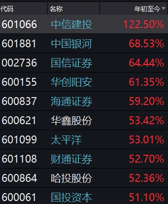 据Wind统计,年初至今,券商指数已经整体上涨37.05%。其中,中信建投以122.5%的增幅领衔券商股,中国银河、国信证券等涨幅也超过60%。(中新经纬APP) |