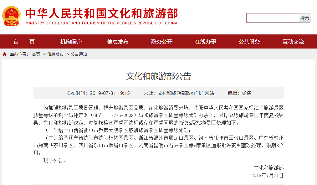 7月31日晚间,文旅部发布公告称,根据5A级旅游景区年度复核结果,决定对复核检查严重不达标或存在严重问题的7家5A级旅游景区处理如下:给予山西省晋中市乔家大院景区取消旅游景区质量等级处理;给予辽宁省沈阳市沈阳植物园景区、浙江省温州市雁荡山景区、河南省焦作市云台山景区、广东省梅州市雁南飞茶田景区、四川省乐山市峨眉山景区、云南省昆明市石林景区等6家景区通报批评责令整改处理,限期3个月。