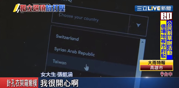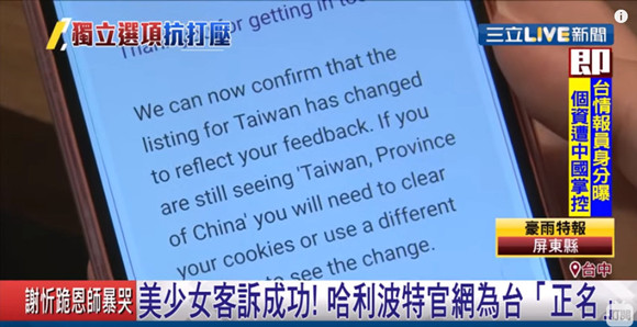 这则“投诉成功”的消息被中国台湾三立电视台“三立LIVE新闻”节目报道,称“美少女客诉成功!哈利波特官网为台‘正名’。”节目中透露,一位名叫张凯涵的台湾女大学生在哈利波特官网上注册账户时,对选择国籍时“台湾”后面有一个逗号,并显示为“中国一省”而感到不满,因此向哈利波特官方投诉,并成功使官方做出回应并修改网页。对此,张凯涵表示“我很开心啊。”
