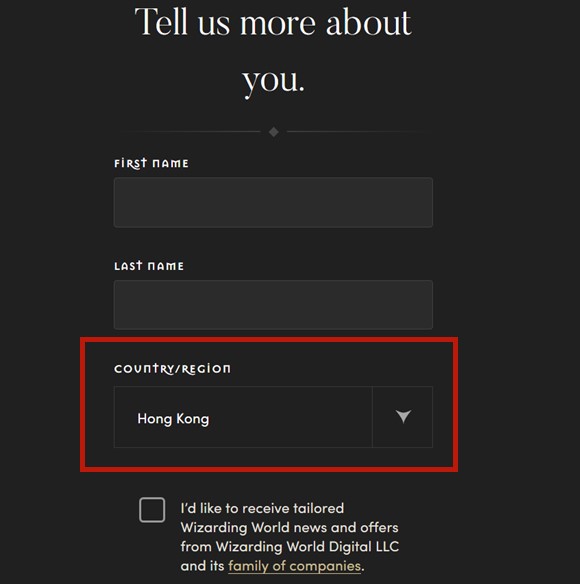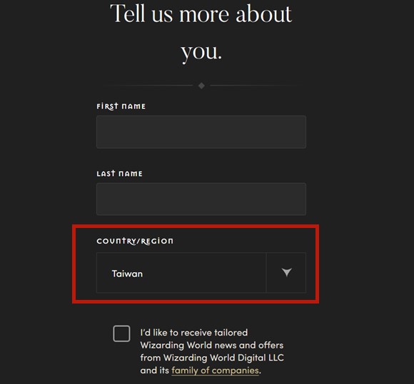 记者登录了哈利波特官方网站网址pottermore.com,在选择注册新账户后,页面随即跳转到wizardingworld.com,该网站同样是JK罗琳的哈利波特官网之一。在选择所在地时,记者注意到台湾被单独显示,且后缀没有“中国一省”。中国写作“China”,作为单独选项。此外,记者发现香港和澳门也同样被单独列出,没有在后缀注明“中国”。