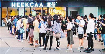 随着奶茶消费群体的扩大,一批产品特色鲜明、营销手段丰富的奶茶引发了年轻消费者的追捧。图为人们在一家“喜茶”店前排队等待。
