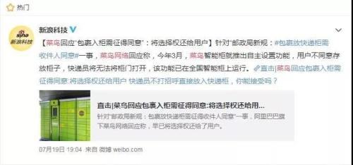 对此,菜鸟网络回应称,从今年3月开始,自主设置功能已在全国上线,“用户不同意存放柜子,快递员将无法将柜门打开”“早已将选择权还给用户”。