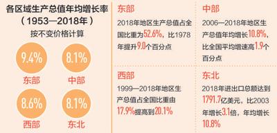 东西南北中纵横联动发展的新格局正在形成,区域发展差距正逐渐缩小。党的十八大以来,按不变价格计算,东部、中部、西部、东北地区人均地区生产总值年均增速分别为7.2%、8.2%、8.5%和6.1%,中西部地区发展速度领先于东部地区。人均最高的东部和最低的西部之间的相对差值,从2003年的高峰值2.5倍逐渐缩小到2018年的1.8倍。